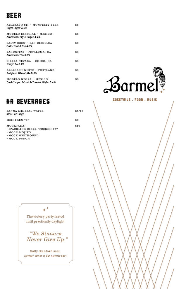 Welcome to Barmel, a hidden gem nestled in the picturesque Carmel-By-The-Sea, California. Located in the charming Carmel Way Courtyard, Barmel offers a vibrant nightlife experience that perfectly blends relaxed elegance with an unpretentious atmosphere. Whether you’re looking for a late-night bite, expertly crafted cocktails, or simply a place to unwind with friends, Barmel has you covered.